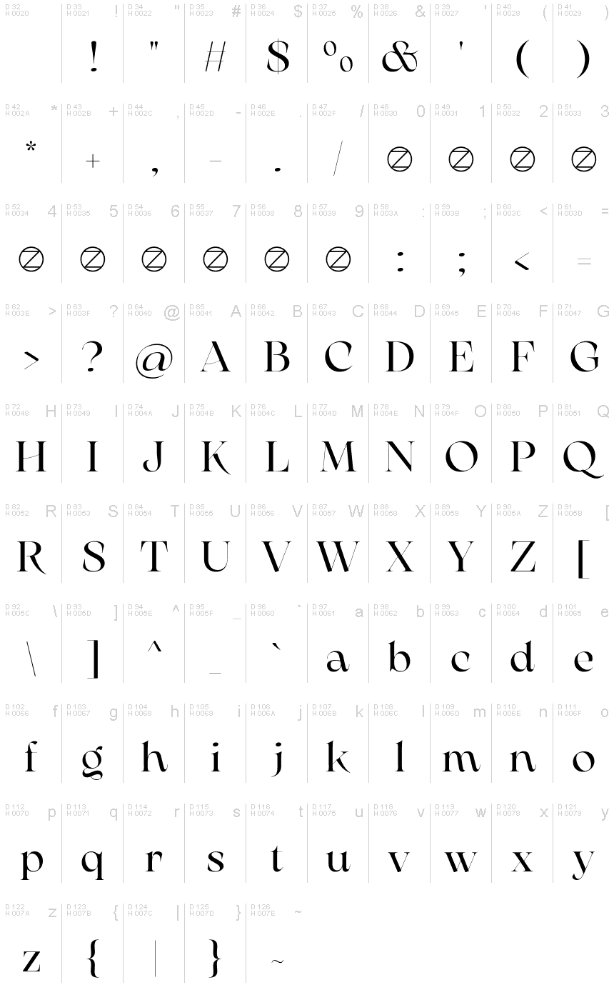 Si prega di utilizzare il menu a tendina per visualizzare le mappe di caratteri diversi contenuti in questo tipo di font.