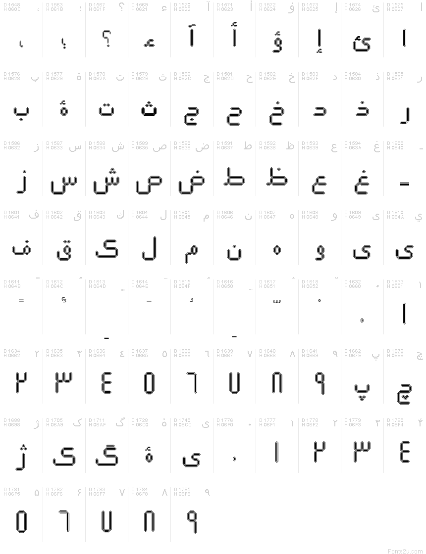 Si prega di utilizzare il menu a tendina per visualizzare le mappe di caratteri diversi contenuti in questo tipo di font.